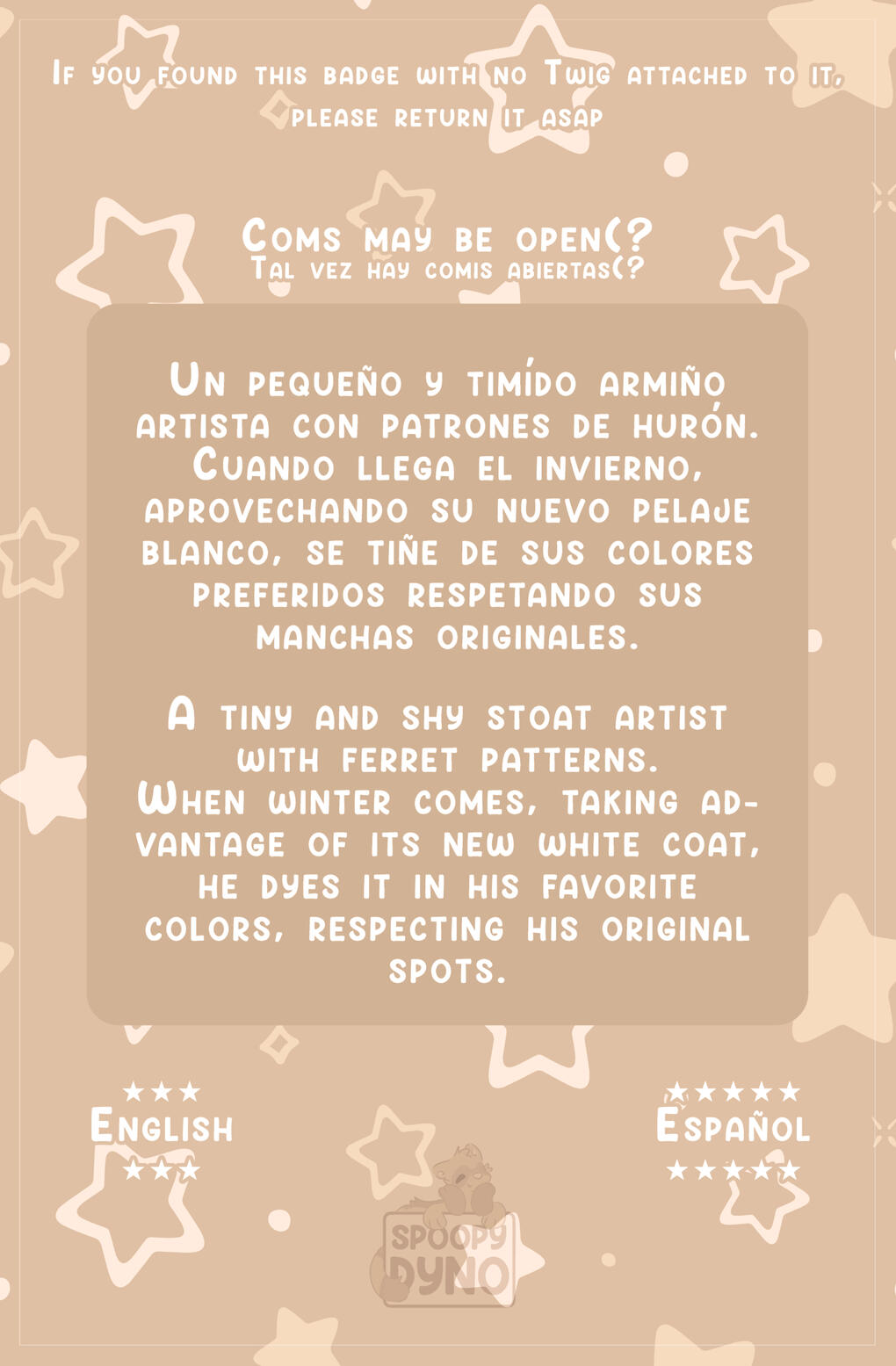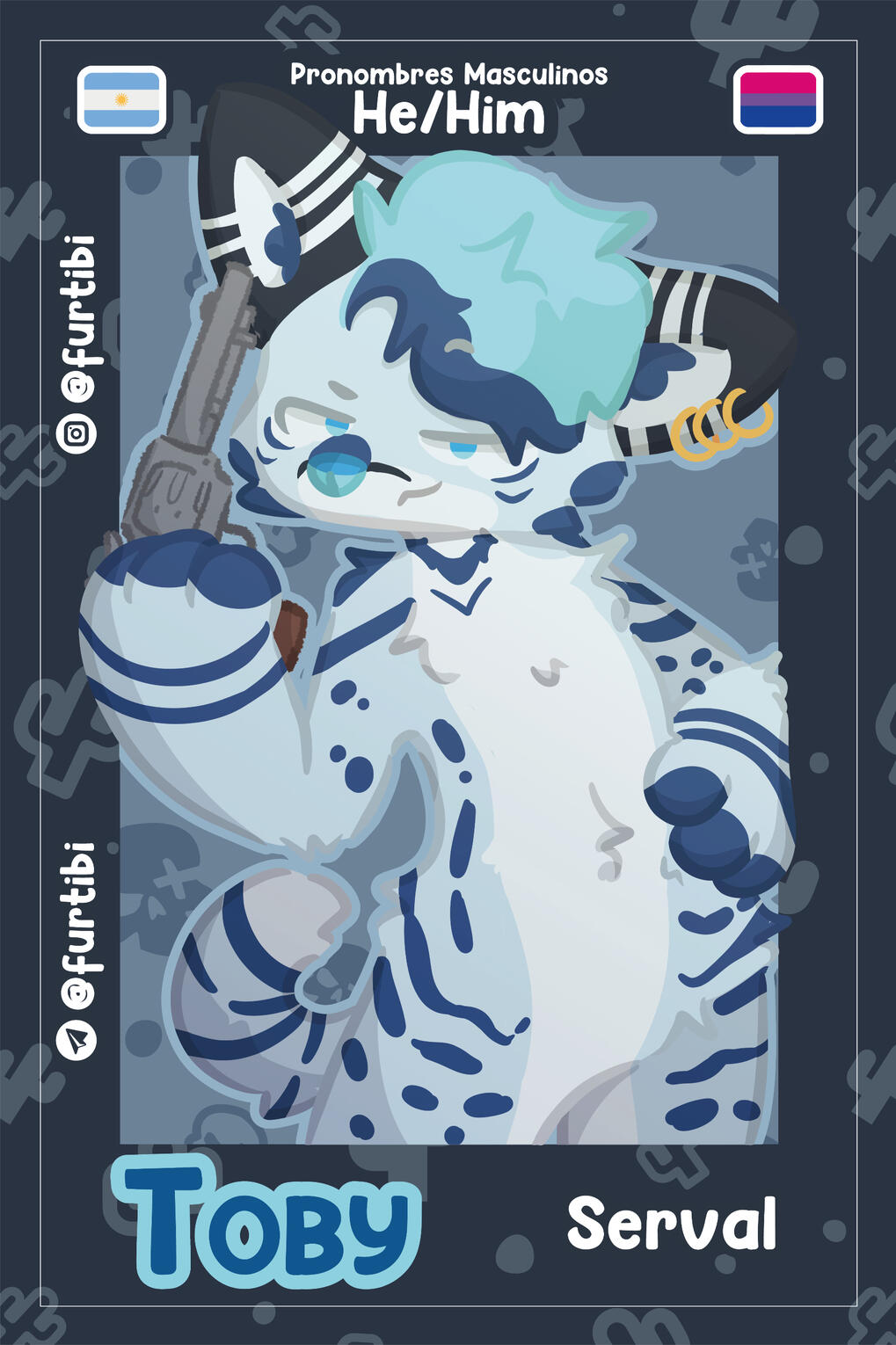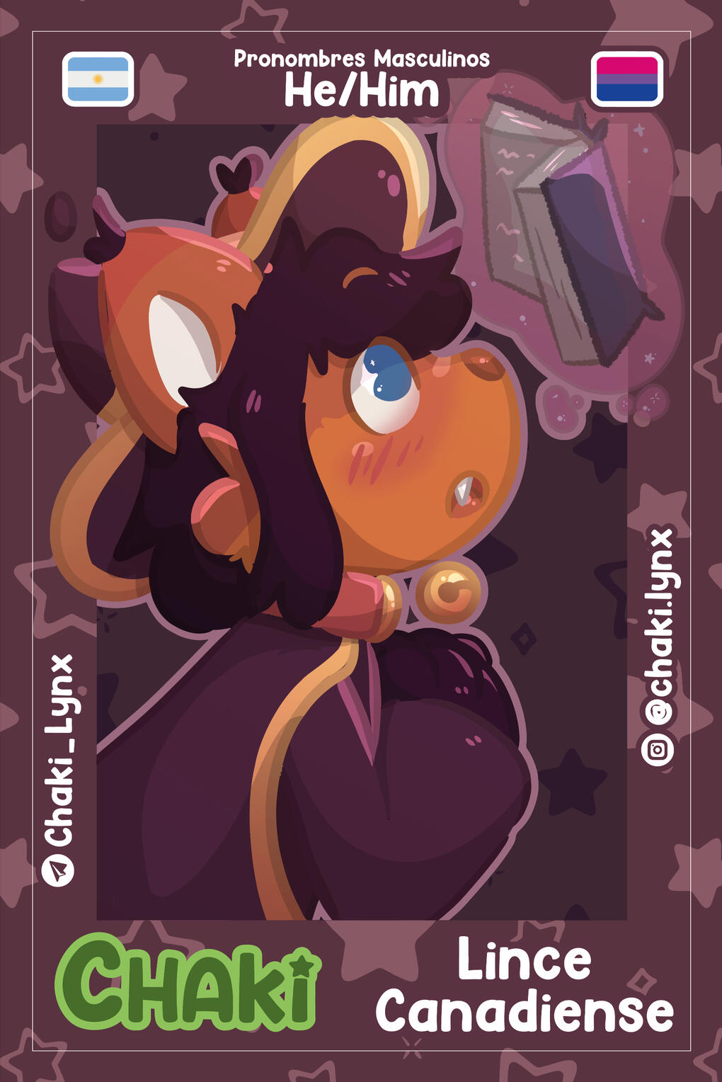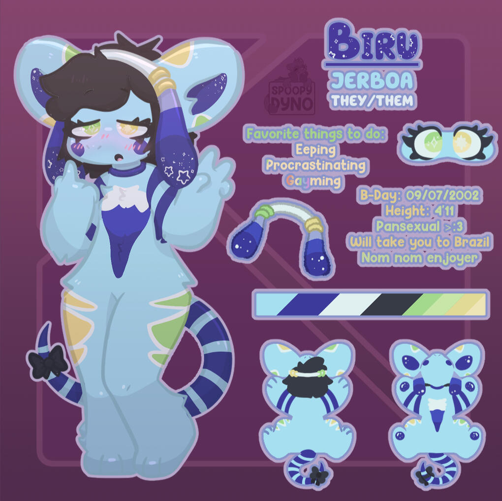 The front has the character's name, their species, their pronouns, two flags, two social medias, and a Half or Fullbody.
